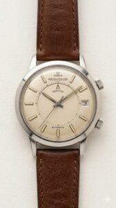 アラーム機能を備えたこのモデルは1950年代に誕生した名作で、中央のディスクでアラーム時刻を設定する独特のダイヤルデザインが特徴。