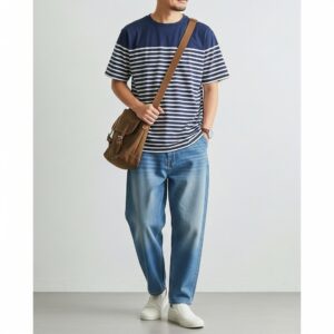 - ボーダーTやチェックシャツ+ゆるめデニム