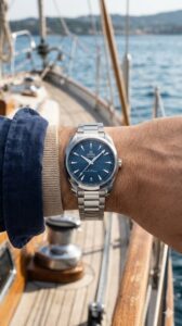 ブルーのチークコンセプトダイヤルは高級ヨットのウッドデッキをイメージしており、海を感じさせる上品なデザインが魅力です。