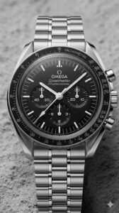 スピードマスターは、1969年のアポロ11号による月面着陸で実際に宇宙飛行士が着用していたことで有名な「ムーンウォッチ」。