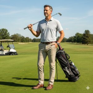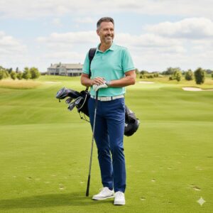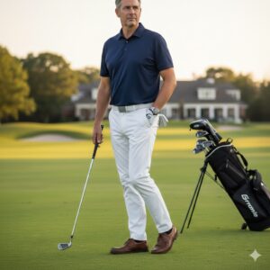 足元のブラウンやネイビーのレザーローファーが全体を引き締め、ラウンド中の動きやすさを損なわずに大人ゴルファーらしい落ち着いた佇まいを完成させます。