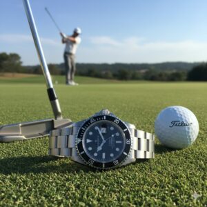サブマリーナーは防水性も高く、朝露や芝生の湿気も気にせず使えるので、プレー中のストレスフリー感も腕元からサポートしてくれるはずですよ。