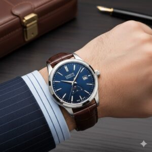 ブルーダイヤルが印象的で、知性と洗練を兼ね備えたビジネスウォッチです。